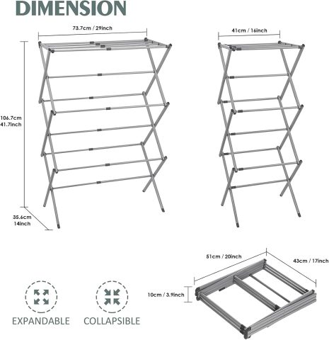 Compact 3-tier drying rack that expands for more hanging space and folds flat for small homes and balconies. Stainless steel frame stays light yet sturdy with non-slip feet for stability. Ideal for daily laundry, towels and activewear.