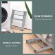 It folds to about 51 × 43 × 10 cm so it slides beside a washer or into a closet.